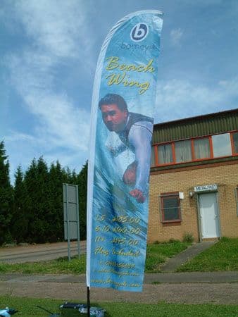 Attractive and highly visible Beach Wing Flag Banner is perfect for indoor or outdoor events. The Beach Wing is available with either a plate base or screw base to suit your requirements. For a more striking flag display, why not try several Beach Wings lined up in a row?